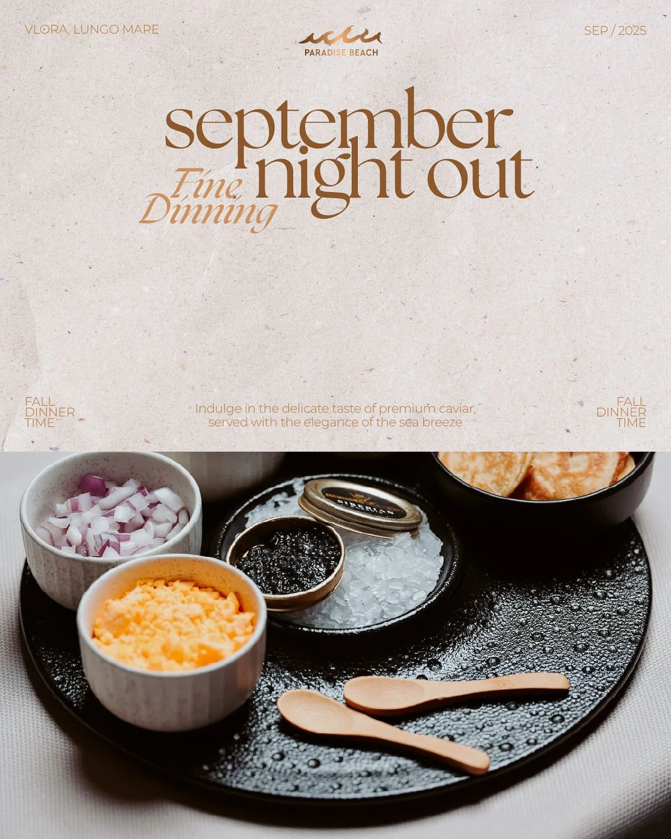 With more than 27 years of experience, Paradise Beach Restaurant has been a beloved culinary destination in Vlorë, proudly being one of the first restaurants in the area. We serve an exquisite Mediterranean menu featuring fresh local seafood, juicy dry-aged meat, and delicious cocktails. Our attentive service and stunning seaside location on Vlorë's busiest street create the perfect setting for a memorable dining experience.